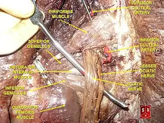 - ↑ Smoll NR (2010). "Variations of the Piriformis and Sciatic Nerve With Clinical Consequence: A Review". Clinical Anatomy 23 (1): 8–17. doi:10.1002/ca.20893. PMID 19998490.