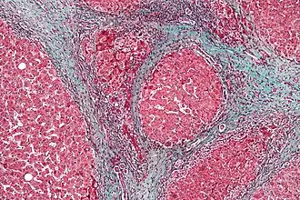 | Imagem microscópica de um fígado com cirrose, causa mais comum de síndrome hepatorrenal. | |