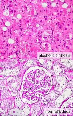 A síndrome hepatorrenal é uma causa de insuficiência renal que acomete indivíduos com cirrose ou, mais raramente, com insuficiência hepática fulminante.[3] A síndrome envolve a constrição dos vasos sanguíneos dos rins e a dilatação dos vasos da circulação esplâncnica, que irriga os intestinos.[4] A classificação da síndrome hepatorrenal estabelece duas categorias de insuficiência renal, denominadas síndrome hepatorrenal dos tipos 1 e 2, ambas ocorrem em indivíduos com cirrose ou falência hepática fulminante. Nas duas categorias, a deterioração da função renal é quantificada por uma elevação do nível de creatinina no sangue ou pela diminuição de sua depuração na urina.[5]