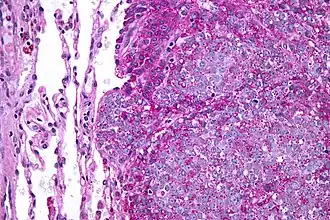 | Fotografia miscroscópica de sarcoma de Ewing metastático (direita) em tecido pulmonar normal (esquerda). Coloração ácido periódico-Schiff. | |