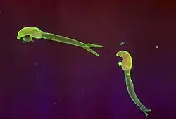 - A forma adulta é a principal e existem dois sexos, ambos fusiformes. O macho é espalmado e mais grosso e têm uma calha longitudinal (canal ginecóforo) no corpo, onde se encaixa e se aloja permanentemente a fêmea, cilindrica e mais fina mas um pouco mais longa. O macho tem cerca de 1 cm e a fêmea 1,5 cm.