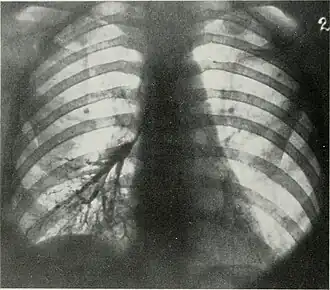 | Árvore bronquial inferior esquerda escurecida por depósitos de poeira metálica. | |