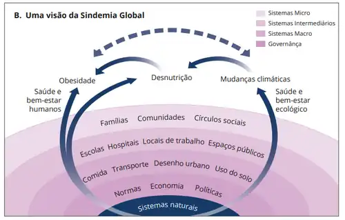 A desnutrição, a obesidade e as mudanças climáticas, quando combinadas, constituem uma sindemia visto que coexistem no tempo e espaço, bem como compartilham determinantes, como aqueles presentes nos sistemas de alimentação, transporte, desenho urbano e uso do solo. Os fatores que compõem tal sindemia global ainda interagem entre si, produzindo sequelas complexas.[8][9]