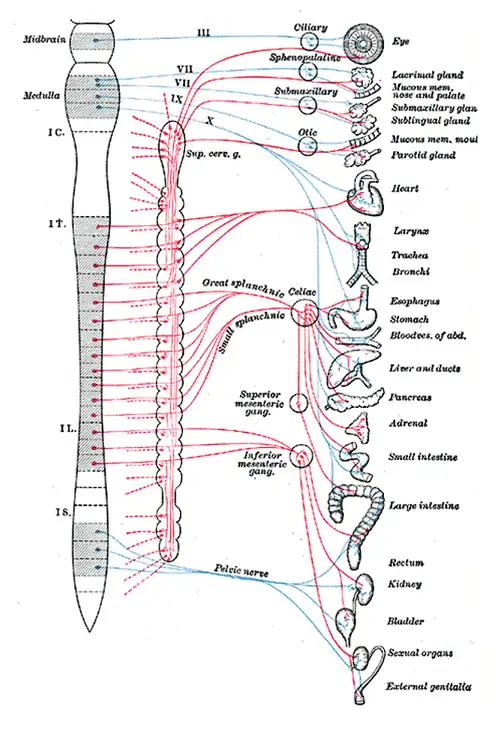 Os neurônios pré-ganglionares do sistema simpático emergem dos segmentos tóraco-lombares (da região do peito e logo abaixo), ao passo que os do sistema parassimpático emergem dos segmentos céfalo-sacrais (da região da cabeça e logo acima dos glúteos).