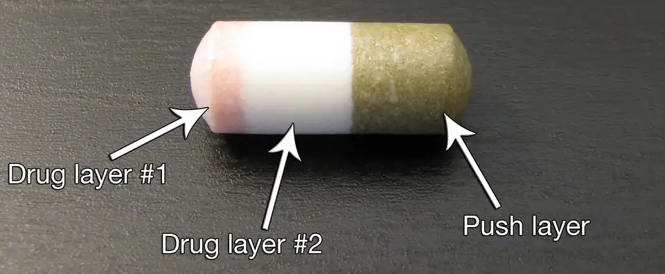 Tanto o EOP quanto o CPOP, sistemas relativamente simples, eram ineficazes na administração medicamentos pouco solúveis.[1] Isso levou ao desenvolvimento de uma camada de pressão interna adicional, a qual era composta por um polímero dilatável que se expandia à medida que absorvia água, que então empurrava a camada do fármaco para fora do orifício de saída, em forma de liberação prolongada. A camada do fármaco é revestir por um polímero viscoso, a fim de permitir a administração de medicamentos com solubilidade baixa.[4] Agentes osmóticos, como cloreto de sódio, cloreto de potássio ou xilitol, são adicionados tanto à camada do fármaco e à camada de pressão, aumentando assim a pressão osmótica.[5] O projeto inicial, desenvolvido em 1982 pelos pesquisadores da ALZA. foi denominado bomba osmótica push-pull (PPOP), e o Procardia XL (nifedipina) foi um dos primeiros medicamentos a incorporar o protótipo PPOP.[2]