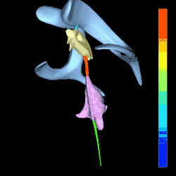 - acima: cauda do núcleo caudado, amígdala (mais à frente), tapetum da corona radiata;
