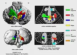 - ↑ Grodd W, Hülsmann E, Lotze M, Wildgruber D, Erb M. Sensorimotor mapping of the human cerebellum: fMRI evidence of somatotopic organization. Hum Brain Mapp. 2001 Jun;13(2):55-73.