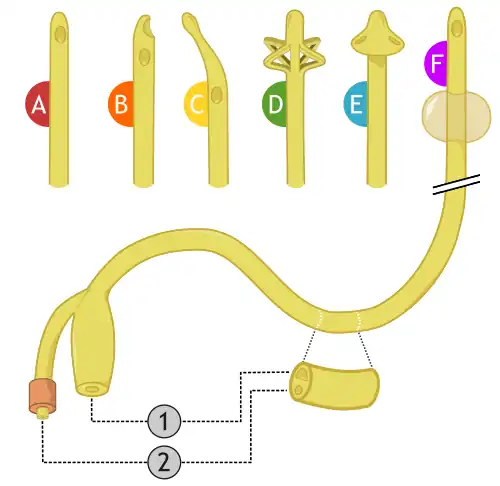 - Cateter Foley ou Sonda permanente: É mantido no lugar por um balão inflado com água. É indicado para condições que afeta os nervos que controlam a bexiga como: espinha bífida, esclerose múltipla, acidente vascular cerebral ou lesão medular. Também é indicada para doenças crônica debilitante ou terminais com perda de mobilidade ou consciência que impedem usar o banheiro ou um instrumento de coleta.[3]