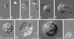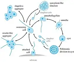 A fase ameboide pode retrair seus filopódios e se tornar um cisto redondo, no qual ocorre a divisão celular palintômica (ou seja, divisões celulares rápidas sem crescimento citoplasmático entre elas, uma característica da clivagem embrionária de animais),[3] gerando 2, 4, 8 ou 16 células flageladas que são liberadas de dentro do cisto.[2]