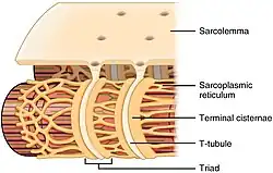 Em células musculares cardíacas, à medida que o potencial de ação passa pelos túbulos T, vai ativando os canais de cálcio tipo L da membrana do túbulo T. A ativação de ditos canais permite que o cálcio passe para o interior da célula. Os túbulos T contêm uma maior concentração de canais de cálcio de tipo L do que o resto do sarcolema e, por tanto, a maioria do cálcio que entra na célula fá-lo através dos túbulos T.[14] Este cálcio une-se e ativa um recetor, conhecido como recetor de ryanodina, localizado no próprio armazém interno de cálcio da célula, o retículo sarcoplásmico. A ativação do recetor de ryanodina causa que o cálcio seja libertado do retículo sarcoplásmico, originando a contração da célula muscular.[15] No entanto, em células do músculo esquelético, o canal de cálcio tipo L está diretamente unido ao recetor de ryanodina do retículo sarcoplásmico permitindo a ativação do recetor de ryanodina diretamente sem necessidade de um influxo de cálcio.[16]