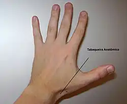 A tabaqueira anatômica ou fossa radial é um aprofundamento triangular na região radial dorsal da mão - ao nível dos ossos carpais, especificamente o escafóide e trapézio.