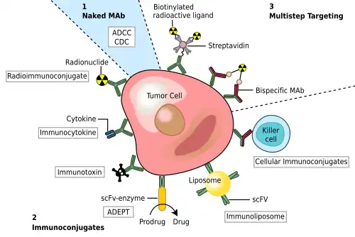 - ↑ Modified from Carter P (novembro de 2001). «Improving the efficacy of antibody-based cancer therapies». Nature Reviews. Cancer. 1 (2): 118–129. PMID 11905803. doi:10.1038/35101072
