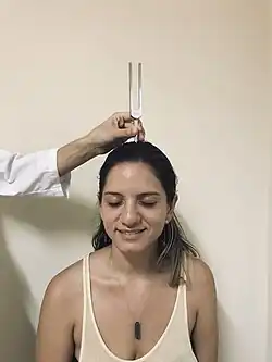 Em uma audição normal, o som e a vibração é percebido no meio da testa. Caso lateralize, é indicativo de perda auditiva.[5]