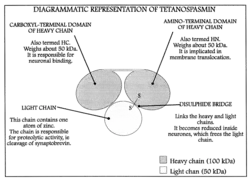 A tetanopasmina é uma potente neurotoxina produzida pela bactéria Clostridium tetani, causadora do tétano, sendo responsável pelos espasmos musculares que ocorrem com a pessoa ou animal acometido. Estruturalmente a toxina do tétano consiste de duas cadeias unidas por ponte de dissulfeto. A cadeia leve é a molécula tóxica, e a cadeia pesada é responsável pela ligação com o receptor. A neurotoxina liga-se irreversivelmente a receptores gangliosídicos nas terminações de seus neurônio motores e é transportada por meio de vesículas do corpo da célula nervosa e seus processos dencríticos no SNC, pelo fluxo intra-axonal retrógrado.