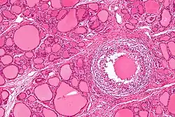 - ↑ Fatourechi V et al.: Clinical features and outcome of subacute thyroiditis in an incidence cohort: Olmsted County, Minnesota, study. J Clin Endocrinol Metab. 2003 May;88(5):2100-5. PMID 12727961