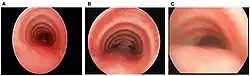 O exame radiográfico pode revelar hiperinsulação, exacerbado estreitamento do lúmen traqueal durante o processo de expiração, ou anormalidades vasculares, tais como arco aórtico duplo.