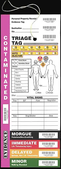Após a observação inicial por parte do pessoal médico ou paramédico, cada vitíma deverá ser etiquetada com um dispositivo designado por etiqueta de triagem. Isto identifica o paciente e o seu diagnóstico e identifica também a prioridade do paciente em relação ao tratamento médico e à evacuação do local do acidente. As etiquetas de triagem apresentam-se em múltiplas variedades. Alguns países usam um padrão nacional único para as etiquetas,[15] enquanto noutros são usadas etiquetas comerciais, variando o modelo em cada jurisdição.[16] Os modelos comerciais mais amplamente usados incluem o METTAG,[17] o SMARTTAG,[18] o E/T LIGHT[19] e o CRUCIFORM.[20] Os sistemas de etiquetagem mais avançados incluem marcadores especiais para indicar se as vitímas foram ou não contaminadas com materiais nocivos, bem como tiras destacáveis para localização do movimento dos pacientes durante o processo. Alguns destes sistemas de localização estão a começar a incorporar o uso de computadores de mão, e nalguns casos códigos de barras. Contudo, caso não estejam disponíveis ou não haja em quantidade suficiente etiquetas de triagem, as vitímas podem simplesmente ser marcadas com recuros a fita colorida ou marcadores de feltro.