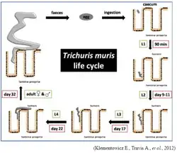 No caso de Trichuris muris, um modelo comum em estudos experimentais, o hospedeiro ingere os ovos embrionados, que são afetados por enzimas gástricas, fragilização dos plugs polares por ação das bactérias da própria microbiota intestinal, facilitando a eclosão da larva no final do intestino delgado e início do intestino grosso [23]. Aproximadamente 90 minutos após a ingestão dos ovos, a larva L1 eclode e penetra nas células epiteliais intestinais pela base da cripta de Lieberkühn [21], rompendo a barreira de muco que recobre o epitélio, o fluxo contínuo de fluido que flui da cripta para o lúmen e a renovação das células epiteliais que ocorrem entre 3 a 5 dias [21][24].