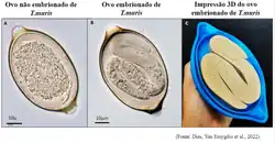 O tamanho dos ovos de tricurídeos pode variar conforme a espécie, devido à morfologia do útero e da vagina das fêmeas do verme adulto. Por exemplo, o ovo típico de Trichuris trichiura mede aproximadamente 50-54 µm de comprimento e 22-23 µm de largura [19]. No entanto, o tratamento com o anti-helmíntico mebendazol, sem um diagnóstico preciso e a concentração adequada em relação à carga parasitária, pode afetar a morfologia dos ovos de Trichuris, dificultando a identificação da espécie do parasito [20].
