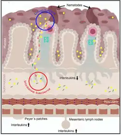 Durante a tricuríase, à medida que o parasito se locomove e rompe o epitélio intestinal, facilita-se a translocação bacteriana para camadas mais profundas do tecido intestinal. Após 45 dias de infecção, o estado imunológico do hospedeiro resulta de uma interação complexa entre a resposta imune induzida pelos antígenos do parasito e a resposta provocada pela invasão bacteriana decorrente da ruptura da barreira epitelial, além da inflamação associada ao dano tecidual [27].