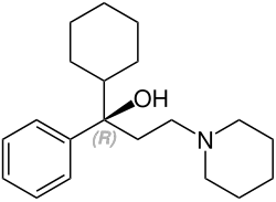 Triexifenidil contém um estereocentro e consiste em dois enantiómeros. Este é um racemato, ou seja, uma mistura 1:1 dos isômeros (R)- e (S)-:[4]