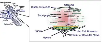 A mácula consiste em três camadas. A inferior é feita células ciliadas sensoriais alojadas na parte inferior da camada gelatinosa. Cada célula tem de 40 a 70 estereocílios e o cinocílio. Esse último é o receptor mais importante para esse processo.