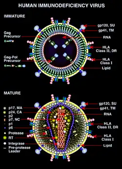 A estrutura do VIH é diferente da de outros retrovírus. É aproximadamente esférica e com um diâmetro de cerca de 120 nm, cerca de 60 vezes menor que um glóbulo vermelho, ainda que grande para um vírus.[20][21] É composto por duas cópias de ARN positivo de cadeia única de senso positivo com aproximadamente 9749 nucleotídeos[22] que codifica os nove genes do vírus, envolto por um capsídeo cónico composto de 2 milcópias da proteína viral p24.[23] O ARN de cadeia único está intimamente ligado às proteínas da nucleocapside, p7, e às enzimas necessárias ao desenvolvimento do virião como a Transcriptase reversa, a aspartate protease, ribonuclease e integrase. O capsídeo é envolto por uma matriz composta pela proteína viral p17, assegurando a integridade da partícula do virião.[23]