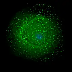 Micrografia eletrônica de varredura de VIH-1, em cor verde, saindo de um linfócito cultivado.