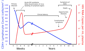 Gráfico da relação entre as cópias do HIV (carga viral) e a contagem de CD4 ao longo do curso médio de uma infeção não tratada de VIH.                      Contagem de linfócitos T CD4+ T (nº de células por µL)                      Cópias de ARN do VIH por mL de plasma