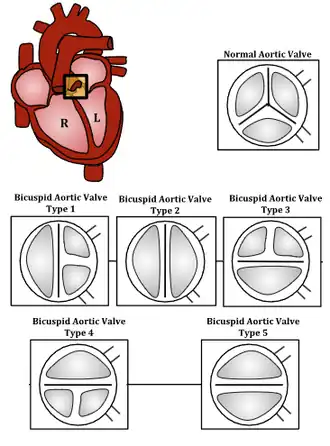 | A válvula aórtica controla o fluxo sanguíneo proveniente do ventrículo esquerdo do coração (a válvula está dentro da caixa amarela). Existem cinco tipos de valva bicúspide, sendo o tipo 1 o mais comum. | |