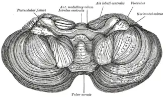 ![]() Vista anterior do cerebelo. ("Tuber vermis" indicado na parte inferior.) | |
