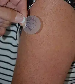 A via transdérmica é uma via de administração, caracterizada pela aplicação na pele, como um adesivo, para ser absorvida pela circulação. O local de aplicação mais comum é atrás do pavilhão auricular, por ser um local com grande vascularização.[1][2], mas pode ser aplicado (colado) em qualquer parte do corpo, mas de preferência as áreas com grande vascularização e em superfícies planas (não em dobra de articulações, por exemplo), como parte superior do tronco, parte superior do braço, parte superior, inferior das costas ou do lado do tórax. A região que receberá o adesivo não deve estar irritada ou lesionada, não teve ter pelos e sem grandes cicatrizes, e deve ser lavada antes apenas com sabão neutro e a pele deve estar seca. Nunca aplique óleos hidratantes, cremes, loções e qualquer tipo de maquiagem em cima e próximo a região onde se encontra o adesivo, pois ele pode descolar e até perder sua eficácia.