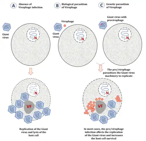Virofagos só se replicam na presença de vírus gigantes, pois não possuem enzimas próprias. Usam a maquinaria de transcrição do vírus co-infectante, e não da célula hospedeira.