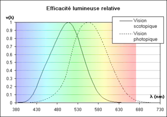 A sensibilidade do olho humano aos diferentes comprimentos de onda em visão escotópica defere substancialmente da sensibilidade em visão fotópica (ver a tabela abaixo), atingindo o seu pico em torno dos 507 nanômetros. Em consequência, na literatura científica surge por vezes o termo lux escotópico, o qual corresponde ao lux fotópico corrigido utilizando a escala ponderal obtida pela aplicação da função de luminosidade escotópica.[4]