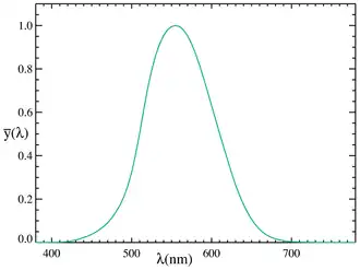 A sensibilidade do olho humano em visão fotópica não é a mesma para todos os comprimentos de onda (ver quadro abaixo), atingindo a sua máxima sensibilidade em torno dos 555 nanometros. O olho humano usa três tipos de cones para identificar três cores fundamentais. Os pigmentos biológicos existentes nos cones têm valores máximos de absorção da luz nos comprimentos de onda de 420 nm (azul), 534 nm (verde-azulado) e 564 nm (amarelo-esverdeado). A sua gama de sensibilidade sobrepõe-se para permitir visão em todo o espectro visível. A eficácia máxima de absorção é de 683 lumens/W no comprimento de onda de 555 nm (verde).[1]