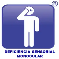 A mão sobre um dos olhos é o símbolo que representa as pessoas com deficiência visual que enxergam com apenas um olho. Os monoculares têm a sensação tridimensional limitada, portanto, essas pessoas apresentam noção de profundidade bastante limitada. O símbolo serve de orientação para que a população identifique os monoculares nas mais diversas situações.[3]