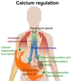 Regulação do cálcio no corpo humano.[18] O papel da vitamina D ativa (1,25-dihidroxivitamina D, calcitriol) é mostrado em laranja.