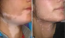 Vitiligo é uma condição crónica caracterizada por áreas de despigmentação da pele.[1] As áreas afetadas tornam-se brancas e geralmente apresentam margens bem delimitadas.[1] Os pelos da pele podem também tornar-se brancos.[1] A condição pode também afetar o interior da boca e do nariz.[2] Geralmente afeta os dois lados do corpo.[1] Em muitos casos, a despigmentação começa em áreas de pele expostas ao sol.[2] A condição é mais evidente em pessoas com pele escura.[2] O vitiligo pode causar estresse psicológico e as pessoas afetadas podem ser alvo de estigma social.[1]
