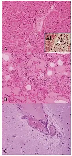 | Lesões de Weissella confusa na coloração Cercopithecus mona (hematoxilina e eosina): A) fígado: tríade portals com neutrófilo infiltração (x10); A1, presença de êmbolos bacterianos no interior da veia (seta) (x40). B) aguda pneumonia: edema, congestão, e leucócitos células exsudação nos alvéolos pulmonares (x10). C) encefalite: congestão e neutrófilos marginalizados em vaso nervosos (x10) | |