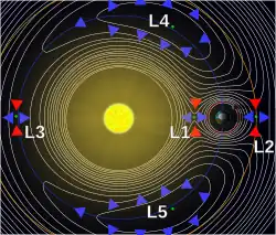 Diagrama dos pontos de Lagrange provocados pelas forças gravitacionais da Terra e do Sol.
