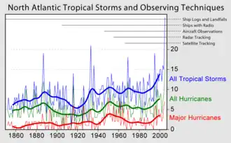 - ↑ Centro Nacional de Furacões (22 de Maio de 2006). «Annual average official track errors for Atlantic basin tropical cyclones for the period 1989-2005, with least-squares trend lines superimposed». National Hurricane Center Forecast Verification (em inglês). Consultado em 30 de novembro de 2006