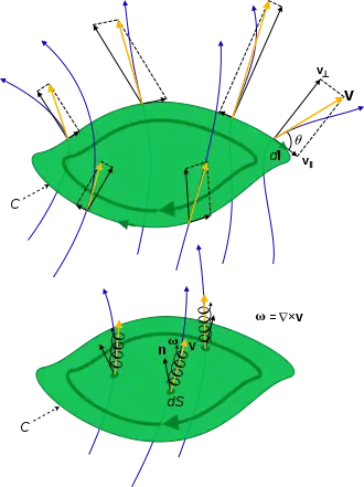 Pelo teorema de Stokes, o flux de vetores rotacional ou vorticidade através de uma superfície S é igual à circulação em torno de seu perímetro,[3]