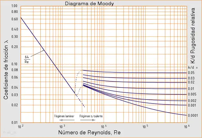 No caso de fluxo laminar o fator de atrito depende unicamente do número de Reynolds. Para fluxo turbulento, o fator de atrito depende tanto do número de Reynolds como da rugosidade relativa da tubulação, por isso neste caso é representado mediante uma família de curvas, uma para cada valor do parâmetro , onde k é o valor da rugosidade absoluta, ou seja, o comprimento (habitualmente em milímetros) da rugosidade diretamente medível na tubulação.