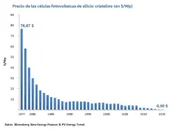 - ↑ «El precio de los paneles fotovoltaicos disminuye un 50% en un solo ano (y como afectará esto a los coches eléctricos)» (em espanhol). (r)Evolución Energética. 25 de agosto de 2009. Consultado em 30 de julho de 2014