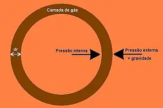 O fluido está submetido à força gerada pelo seu próprio campo gravitacional. Esta força é radial e aponta para o centro da estrutura. A magnitude da força gravitacional é denotada pela letra g é considerada uma função da distância ao centro r: