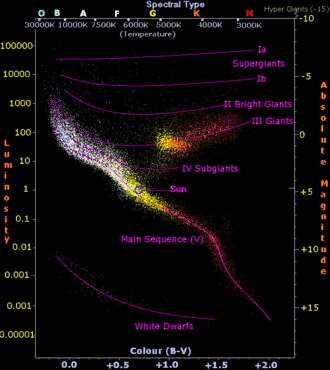 A temperatura estelar determina a taxa de energização ou ionização de diferentes elementos, resultando em linhas de absorção características no espectro. A temperatura superficial de uma estrela, junto com sua magnitude absoluta visual e características de absorção, são usadas para classificar uma estrela (ver a classificação abaixo).[38]