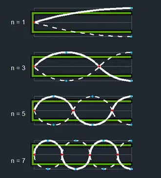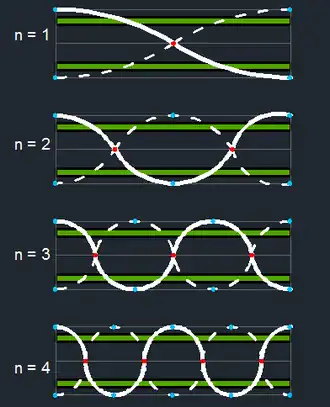 A mais simples configuração possível nessa condição é ter um antinó no centro da corda. Como o comprimento de onda é a distância entre duas cristas ou dois vales consecutivos,[2] é notável que, para essa configuração, .