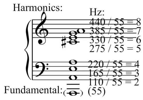 Se escolhermos o som gerador como o Lá-1 (utilizando a numeração internacional de oitavas[4]), a oitava teclada branca de um piano moderno de 88 teclas, teremos uma frequência de 55 Hz. Para essa série harmônica, o Lá-1, de 55 Hz,[7] é o som gerador, de . Temos que: