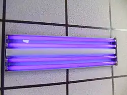Este tipo de lâmpada possui um material de filtro violeta, seja na lâmpada ou em um filtro de vidro separado na caixa da lâmpada, que bloqueia a maioria das luzes visíveis e permite através de UV[3] para que a luz tenha um brilho violeta fraco quando estiver ligada.[4][5] Um segundo tipo de lâmpada produz ultravioleta, mas não tem o material do filtro, de modo que produz mais luz visível e tem uma cor azul.[5][6] Estes tubos são feitos para uso em armadilhas de insetos.[5][6]