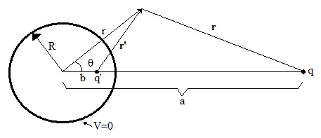 Uma carga pontual é posicionada a uma distância a do centro de uma esfera condutora de raio R, a qual possui potencial igual a zero, ou seja, está aterrada. De acordo com o método das imagens, pode-se substituir as cargas induzidas na esfera condutora pela carga pontual por uma outra carga pontual q', no mesmo eixo a uma distância b do centro da esfera condutora. Para esta situação equivalente, o potencial será: